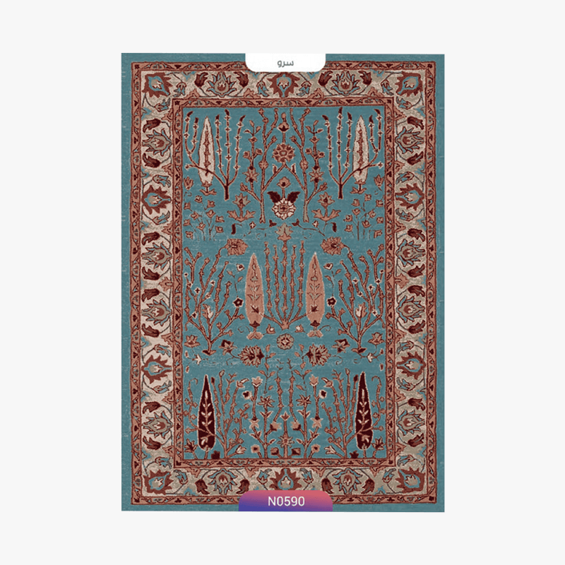 این فرش با نام سَرو (Sarv) شناخته می‌شود و الهام‌گرفته از طرح‌های اصیل ایرانی است که نماد استقامت و جاودانگی در آن نقش بسته است. زمینه فیروزه‌ای روشن و نقوش سرو و گل‌های ختایی، جلوه‌ای خاص و چشم‌نواز به فضا می‌بخشند و حس آرامش و اصالت را در دکوراسیون خانه تقویت می‌کنند.